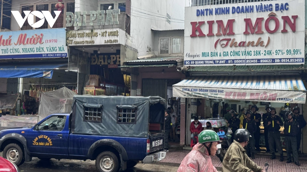 Ghi nhận thực tế tại doanh nghiệp tư nhân kinh doanh vàng bạc Kim Môn, số 89 đường Quang Trung, phường Buôn Ma Thuột vào sáng 20/11, có một số xe chuyên dụng biển xanh đỗ phía ngoài cùng nhiều Cảnh sát Cơ động túc trực làm nhiệm vụ.