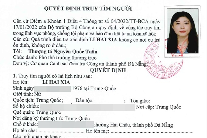 Liên quan vụ án này, Cơ quan Cảnh sát điều tra cũng ra quyết định truy tìm đối với Li Hai Xia (sinh năm 1976); Gu Shiping (sinh năm 1981) và Zhang Xue Qin (sinh năm 1978), cùng quốc tịch Trung Quốc để phục vụ công tác điều tra. Theo cơ quan Công an, đây là 3 đối tượng liên quan đến hoạt động điều hành, quản lý, hỗ trợ chuyên môn và tài chính tại phòng khám. Bước đầu xác định, các đối tượng này có dấu hiệu tham gia vào các hoạt động trái pháp luật, tổ chức khám chữa bệnh không đúng quy định, chi phối hoạt động tài chính và lợi dụng người Việt Nam đứng tên để che giấu hành vi vi phạm.