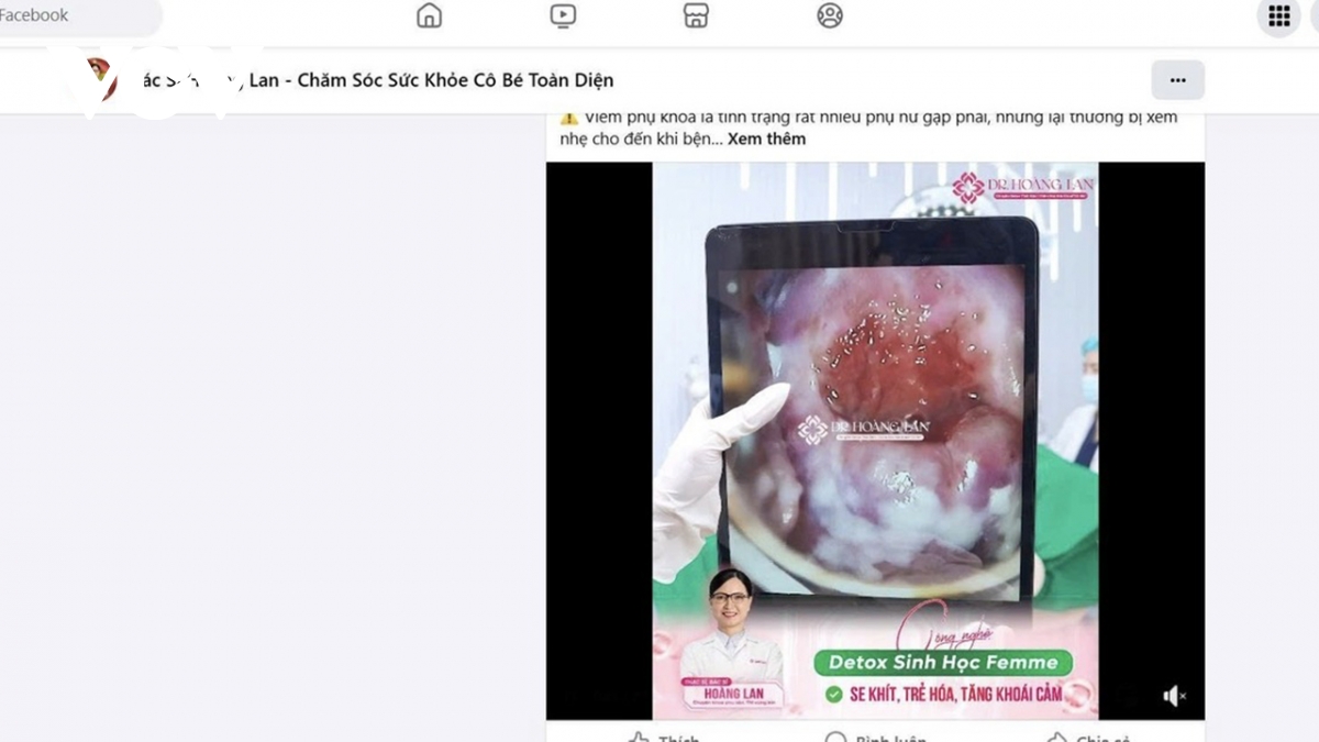 Chỉ cần vài cú nhấp chuột trên Facebook, hàng loạt fanpage tự xưng bác sĩ mọc lên với những lời mời gọi “chữa lành” cho vùng kín phụ nữ. Điển hình như trang “Bác sĩ T.N – Detox thải độc Cô Bé" đăng tải nội dung: “Tử cung đầy rác sẽ thế nào?, “Làm 1 lần sướng 1 đời, hoàn tiền nếu không hiệu quả”.