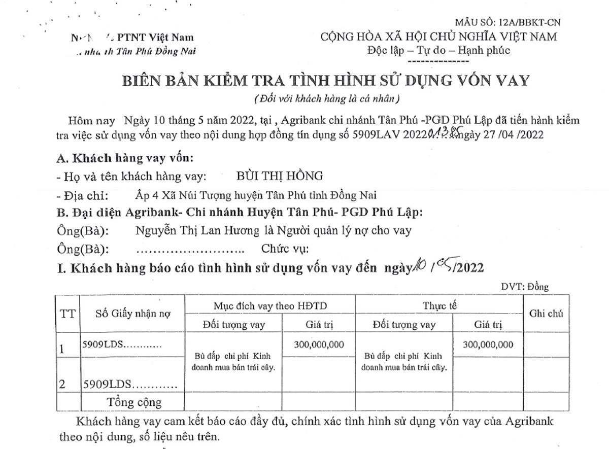 Bà Lan Hương là người được lãnh đạo Chi nhánh Agribank Tân Phú giao tiếp nhận, xử lý 12 hồ sơ vay của Khánh. Các hồ sơ vay còn lại được giao cho 2 nhân viên ngân hàng khác. 12 hồ sơ mà bà Lan Hương tiếp nhận được giải ngân trong thời gian từ ngày 19/4/2022 đến ngày 27/4/2022.