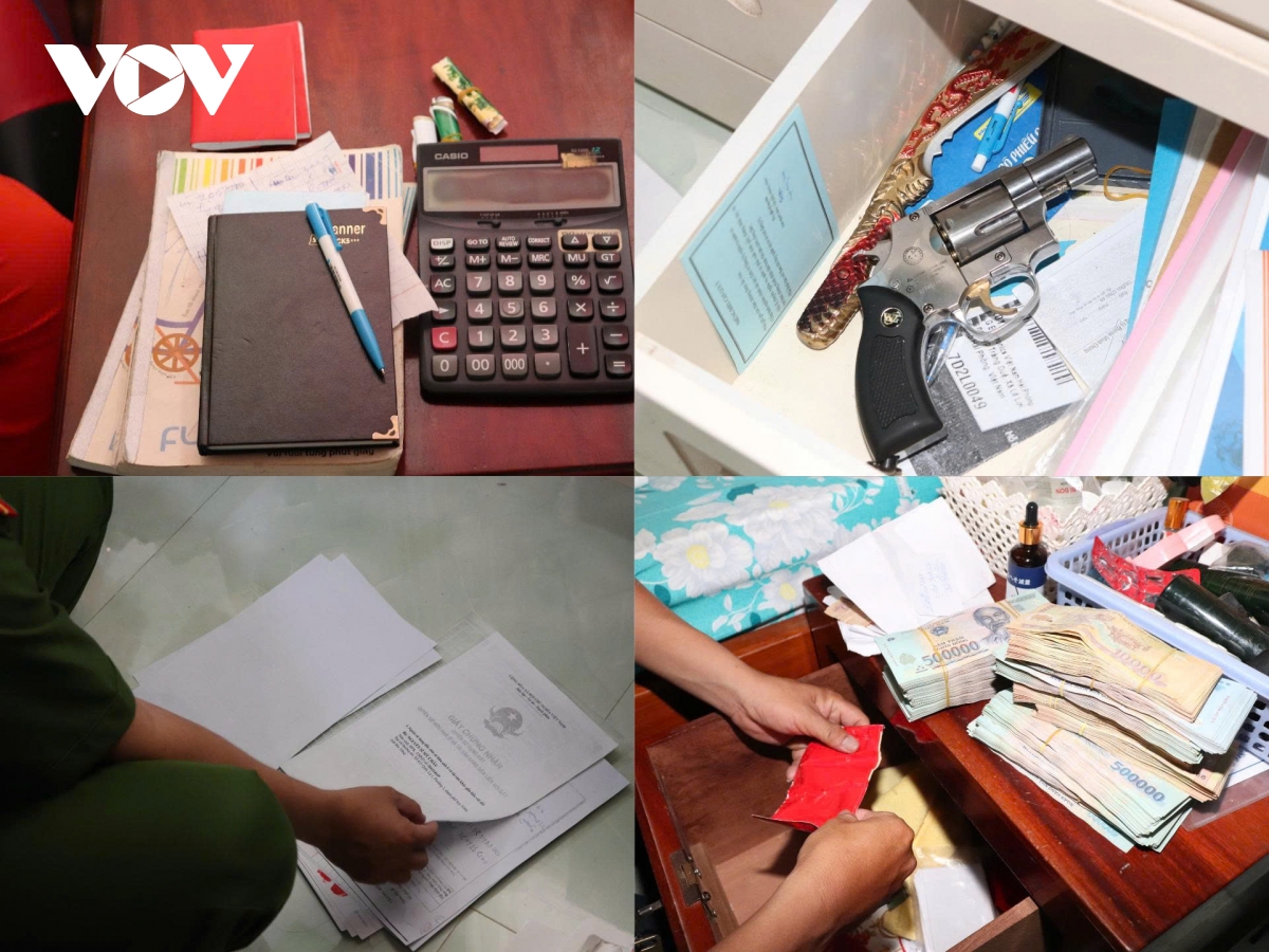Qua khám xét nơi ở của các đối tượng, lực lượng Công an đã thu giữ 1 khẩu súng ổ quay Rulo, 5 viên đạn, 1 vỏ đạn, 60 hợp đồng cho vay, nhiều giấy chứng nhận quyền sử dụng đất, căn cước công dân, chứng minh nhân dân, giấy phép lái xe, số tiền 800 triệu đồng và nhiều giấy tờ, sổ sách có liên quan.