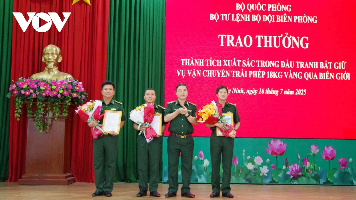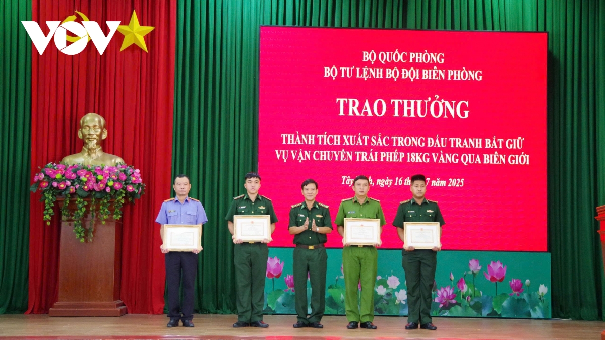 Ngày 16/7, tại Bộ Chỉ huy Bộ đội Biên phòng (BĐBP), Bộ Chỉ huy Quân sự tỉnh Tây Ninh, Bộ Tư lệnh BĐBP Việt Nam tổ chức lễ trao thưởng cho các tập thể, cá nhân có thành tích xuất sắc trong vụ bắt giữ 18kg vàng vận chuyển trái phép qua biên giới.