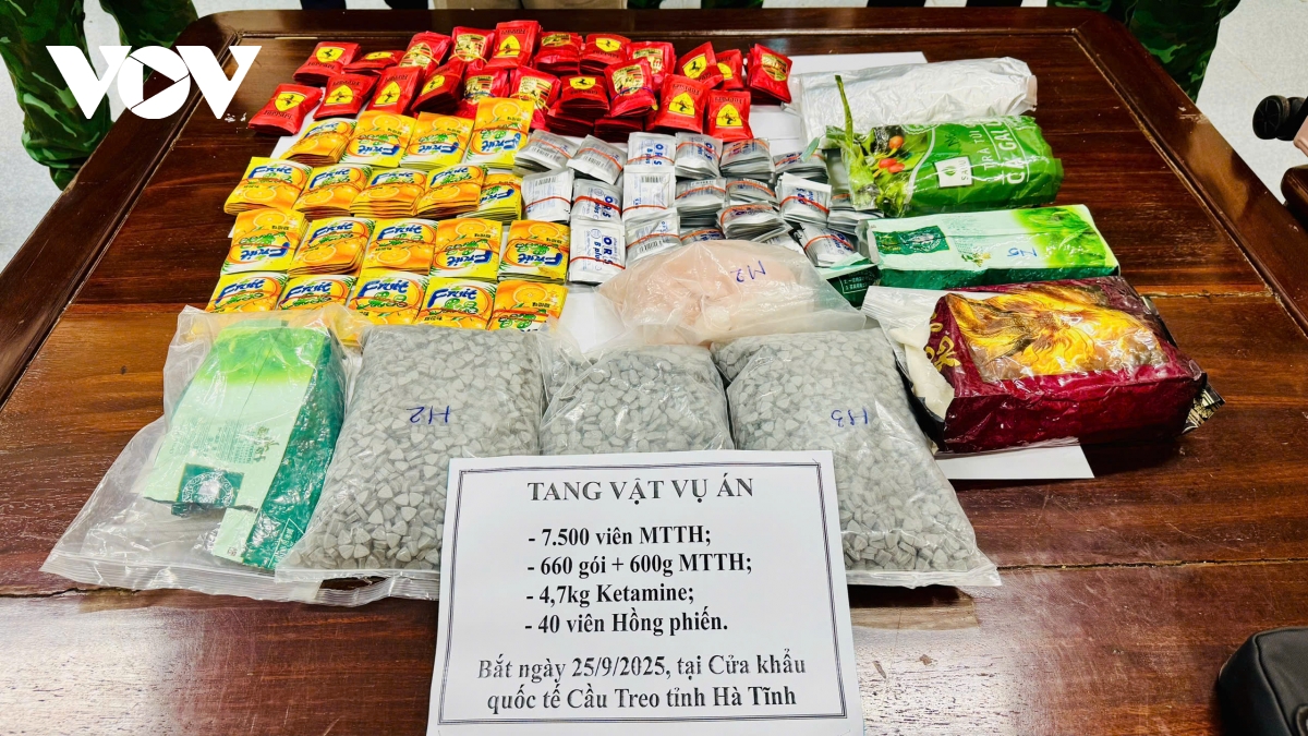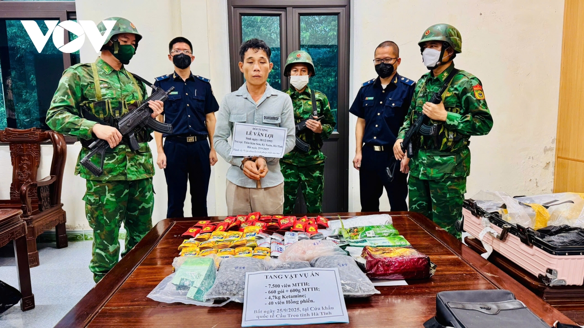 Trước đó, vào lúc 14h40 ngày 25/9/2025, tại luồng nhập cảnh Cửa khẩu Quốc tế Cầu Treo, kiểm tra hành lý của đối tượng Lê Văn Lợi, lực lượng chức năng đã thu giữ tổng cộng gần 14 kg ma túy các loại. Tang vật bao gồm: 7.500 viên thuốc lắc (4,5 kg), 4,7 kg Ketamin, 660 gói nước vui (4,2 kg), 600 gam chất bột màu vàng (ma túy tổng hợp) và 40 viên hồng phiến.