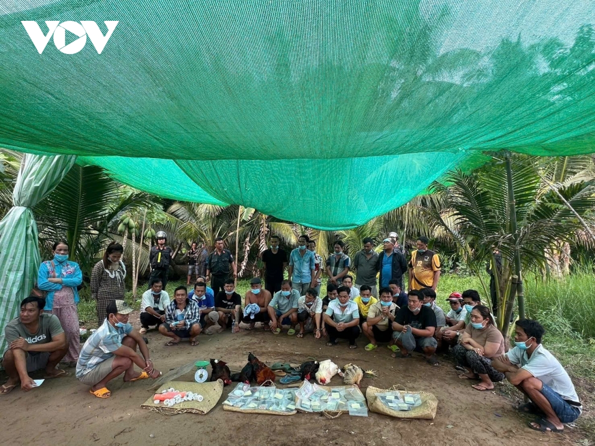 VOV.VN - Thực hiện kế hoạch cao điểm tấn công, trấn áp tội phạm, Phòng Cảnh sát hình sự và Phòng Cảnh sát cơ động vừa phối hợp với công an xã Trung Ngãi (tỉnh Vĩnh Long) tổ chức triệt phá một điểm đánh bạc dưới hình thức lắc tài xỉu và đá gà, thắng thua bằng tiền tại ấp Phú Nông, xã Trung Ngãi, tỉnh Vĩnh Long.