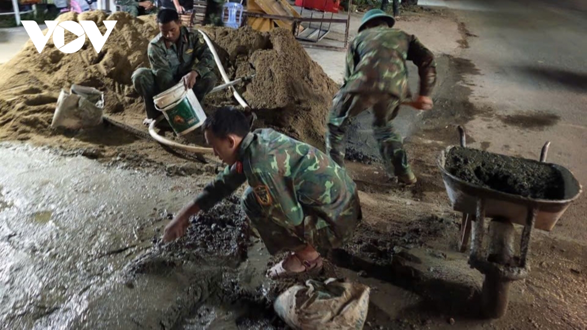 Bộ đội làm việc xuyên ngày đêm, trộn bê tông, hoàn thiện nền nhà giúp người dân sớm an cư.