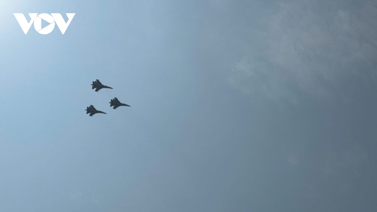 Máy bay trực thăng được chia làm 3 tốp bay, mỗi tốp từ 3-4 máy bay. Ngoài máy bay trực thăng, thì trong sáng nay, Quân chủng Phòng không - Không quân còn thực hiện diễn tập bay với tiêm kích Su-30MK2, Yak-130. Các tốp bay của Su cũng được chia nhóm, mỗi nhóm từ 3-4 máy bay.