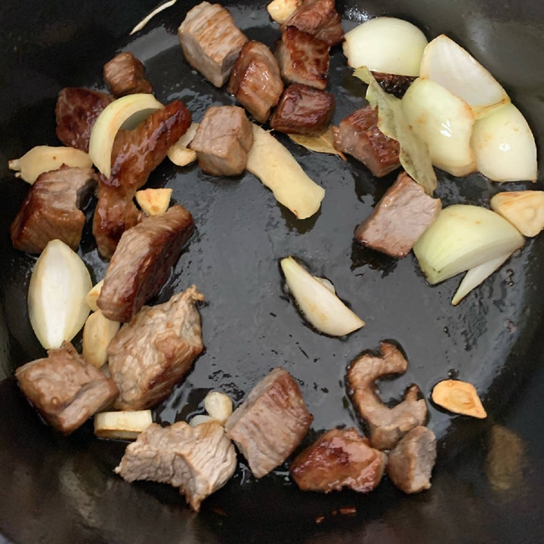 Bỏ dầu thực vật vào nồi. Thêm đường vào, đun lửa vừa - nhỏ cho đến khi đường tan hết. Sau đó cho thịt bò vào đảo đều để thịt bò ngấm đều gia vị. Sau đó cho hành tây, hoa hồi, lá nguyệt quế, ớt khô, tỏi và 3 lát gừng vào. Xào trong khoảng 2 phút.