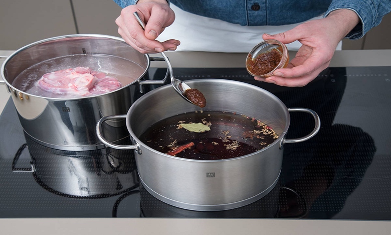 Đối với nước ngâm, thêm 2/5 lượng nước, bạch đậu khấu, hoa hồi, lá nguyệt quế, ớt, đinh hương, hạt ngò, nhục đậu khấu, hạt tiêu, hạt thì là, vỏ chanh, rượu gạo, xì dầu, tương đậu nành và đường vào nồi. Đậy nắp và đun sôi với lửa vừa. Trong khi chờ đợi, cho thịt bò vào nồi lớn, đổ nước lạnh còn lại vào đun sôi.