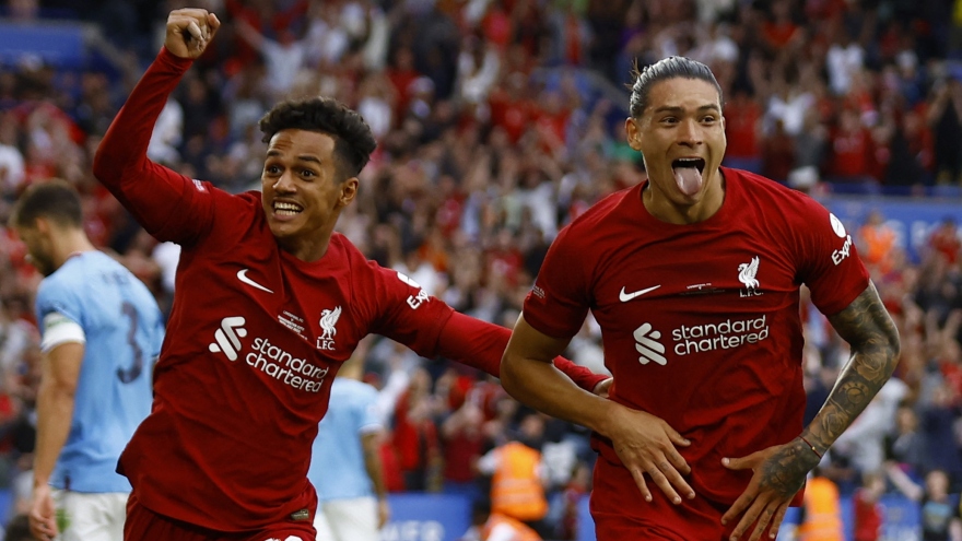 VOV.VN - Darwin Nunez che mờ Earling Haaland với việc mang về một quả phạt đền và trực tiếp ghi bàn ấn định tỷ số để giúp Liverpool vượt qua Man City với tỷ số 3-1 đầy thuyết phục, qua đó giành Siêu Cúp Anh.