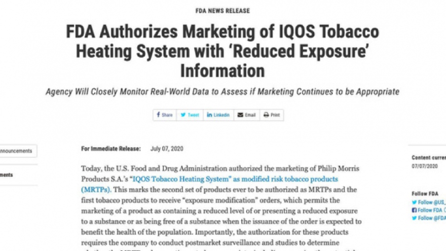 VOV.VN - Cơ quan Quản lý Thực phẩm và Dược phẩm Hoa Kỳ (FDA) đã cho phép sản phẩm thuốc lá làm nóng được phép thương mại và công bố thông tin sản phẩm thuốc lá giảm thiểu phơi nhiễm với các chất gây hại lên cơ thể so với thuốc lá điếu.