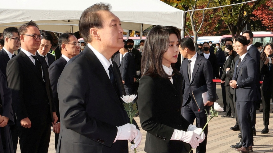 VOV.VN - Tổng thống Yoon Suk-yeol phu nhân hôm nay (31/10) đã đến đặt hoa viếng tại một nơi tưởng niệm những nạn nhân đã thiệt mạng trong vụ giẫm đạp xảy ra vào đêm ngày 29/10 tại khu phố Itaewon, Hàn Quốc.