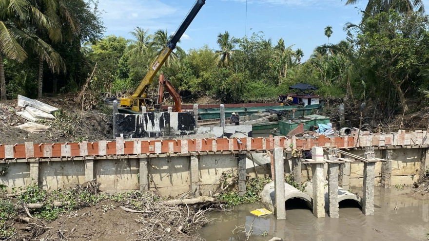 VOV.VN - Nhằm phòng, chống sạt lở, ổn định đời sống người dân, UBND huyện Cái Bè (tỉnh Tiền Giang) vừa triển khai đầu tư gói thầu thi công bờ kè ven bờ Nam sông Cái Bè, thuộc ấp An Ninh, xã Đông Hòa Hiệp, huyện Cái Bè.