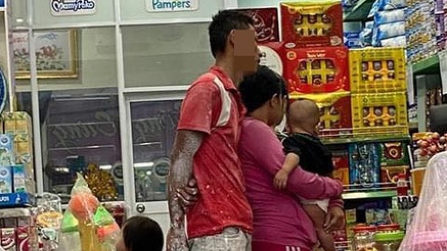 VOV.VN - Với bộ đồ lấm lem bẩn, người bố vẫn vui vẻ dẫn gia đình nhỏ đi mua sắm. Gương mặt hạnh phúc của anh khi nhìn vợ và con chọn đồ khiến nhiều người cảm động.