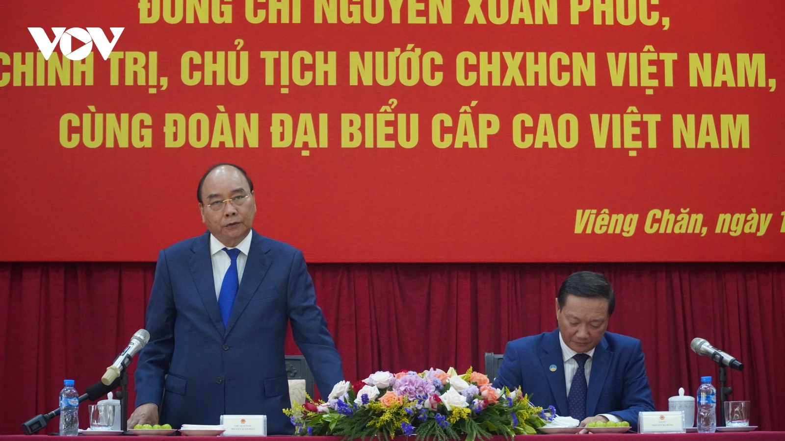 VOV.VN - Chủ tịch nước Nguyễn Xuân Phúc và Phu nhân đã tới thăm hỏi, nói chuyện với nhân viên Đại sứ quán Việt Nam tại Lào và đại diện cộng đồng người Việt Nam, doanh nghiệp, lưu học sinh Việt Nam đang đầu tư, học tập tại Lào.