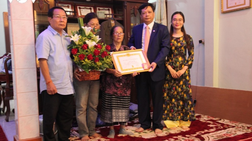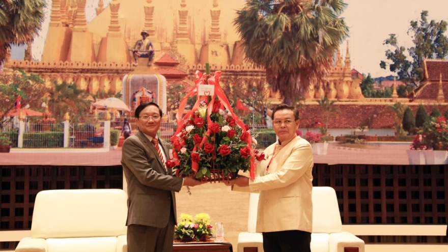 VOV.VN - Đại sứ Nguyễn Bá Hùng đã tặng Chủ tịch Mặt trận Lào xây dựng đất nước Saysomphone Phomvihan lẵng hoa tươi thắm và chúc mừng thành tựu của Lào.