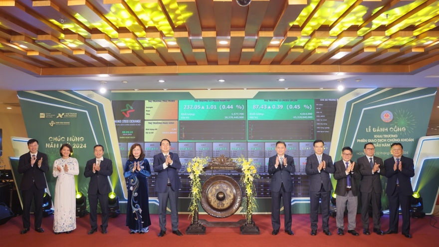 VOV.VN - Sáng nay (2/1), Lễ đánh cồng khai trương phiên giao dịch chứng khoán (GDCK) đầu năm 2024 được tổ chức tại Sở GDCK Hà Nội (HNX). Đây là truyền thống được tổ chức hàng năm vào ngày GDCK đầu tiên của năm mới nhằm khích lệ tinh thần cho công chúng đầu tư, cộng đồng doanh nghiệp và các thành viên thị trường.