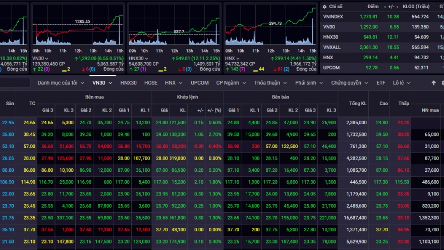 VOV.VN - Thị trường chứng khoán trong nước nối lại đà tăng sau 3 phiên điều chỉnh liên tiếp, đà tăng diễn ra trên diện rộng nhờ sự trở lại của nhóm cổ phiếu vừa và nhỏ. Nhờ dòng tiền chảy mạnh vào nhiều cổ phiếu trụ giúp chỉ số VN-Index tăng mạnh trong phiên chiều lên mốc 1.270 điểm.