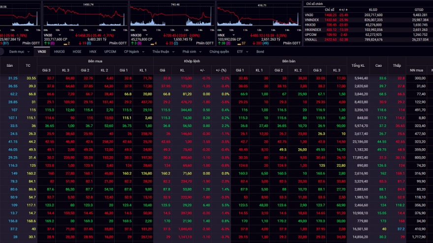 VOV.VN - Lực bán ồ ạt được tung ra, sắc đỏ lan rộng ra khắp bảng điện tử khiến VN-Index lao dốc mạnh theo chiều thẳng đứng. Dù xuất hiện dòng tiền mua vào, nhưng cung vẫn áp đảo so với cầu. VN-Index có thêm phiên lao dốc khi để mất hơn 26 điểm và hơn 160 mã giảm sàn.