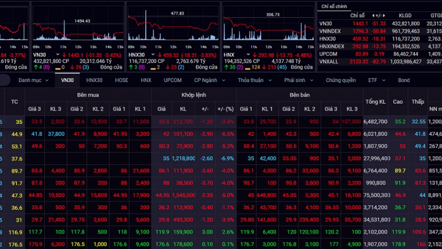 VOV.VN - Trong phiên giao dịch đầu tuần, VN-Index liên tục lao dốc trước áp lực bán tháo trên diện rộng, hàng loạt cổ phiếu giảm sàn khiến VN-Index tuột dốc gần 51 điểm xuống còn 1.296,3 điểm.