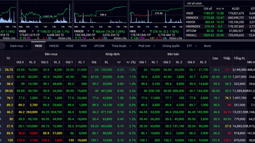VOV.VN - Với sự hỗ trợ tích cực từ thị trường thế giới, chứng khoán trong nước nối đà tăng phiên thứ 5 liên tiếp. VN-Index tăng điểm nhờ nhóm bluechips bứt phá và thanh khoản vẫn ở mức cao. Đặc biệt, nhóm cổ phiếu ngân hàng và Vingroup đóng góp phần không nhỏ vào mức tăng chung của chỉ số.