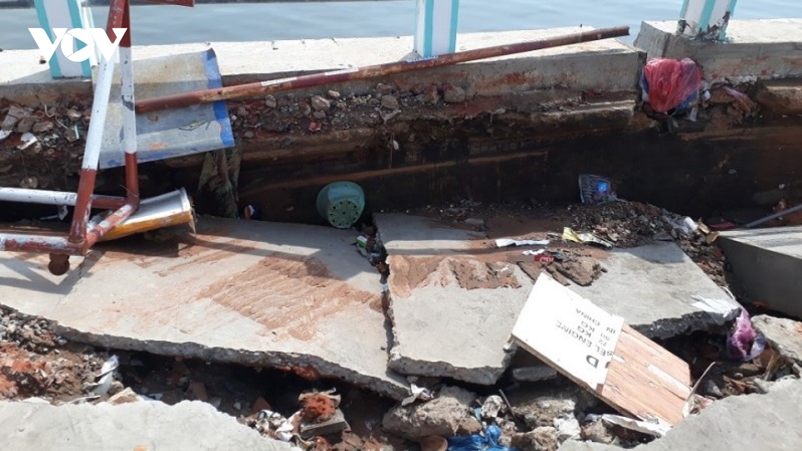VOV.VN - Gần 100m bờ kè sông Cà Ty trên đường Trưng Trắc, thành phố Phan Thiết, tỉnh Bình Thuận đang bị sụt lún, có đoạn bị lún sụt nghiêm trọng dài hàng chục mét.