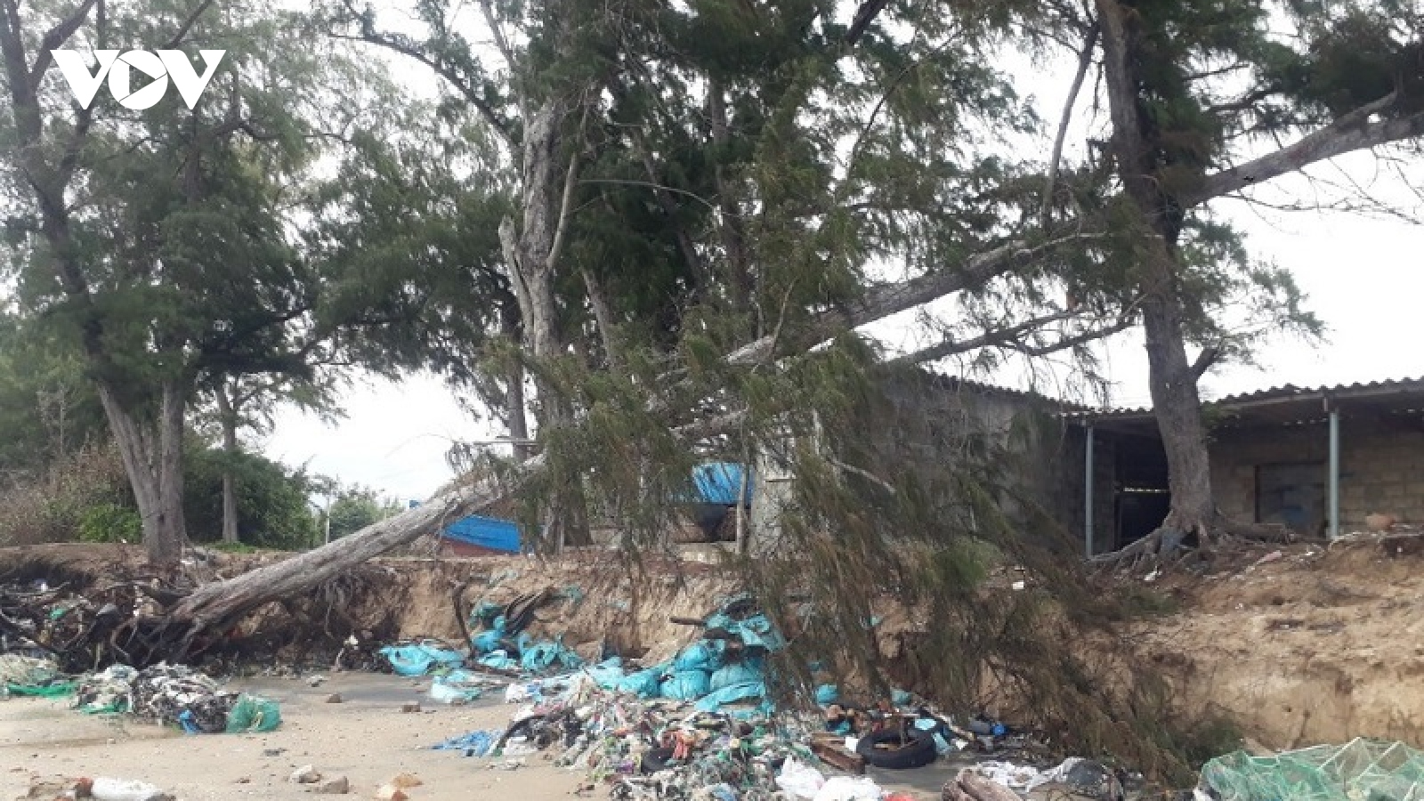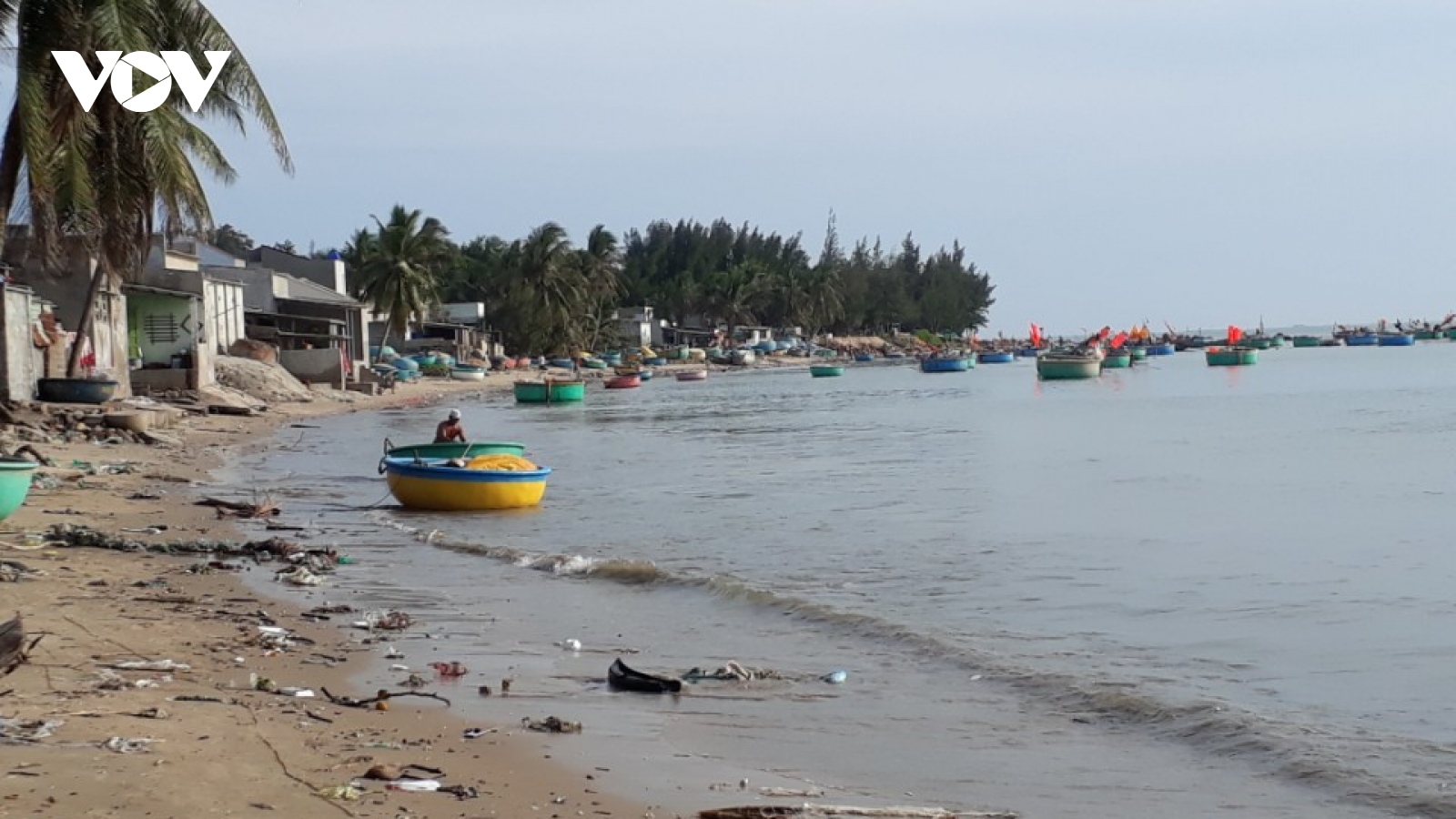 VOV.VN - Thuyền của ông Ngô Chín ở xã Phước Thể, huyện Tuy Phong, tỉnh Bình Thuận đang neo đậu tại bến bãi ngang Bậc Lở, xã Vĩnh Tân, đã bị sóng đánh chìm vào sáng 28/10.