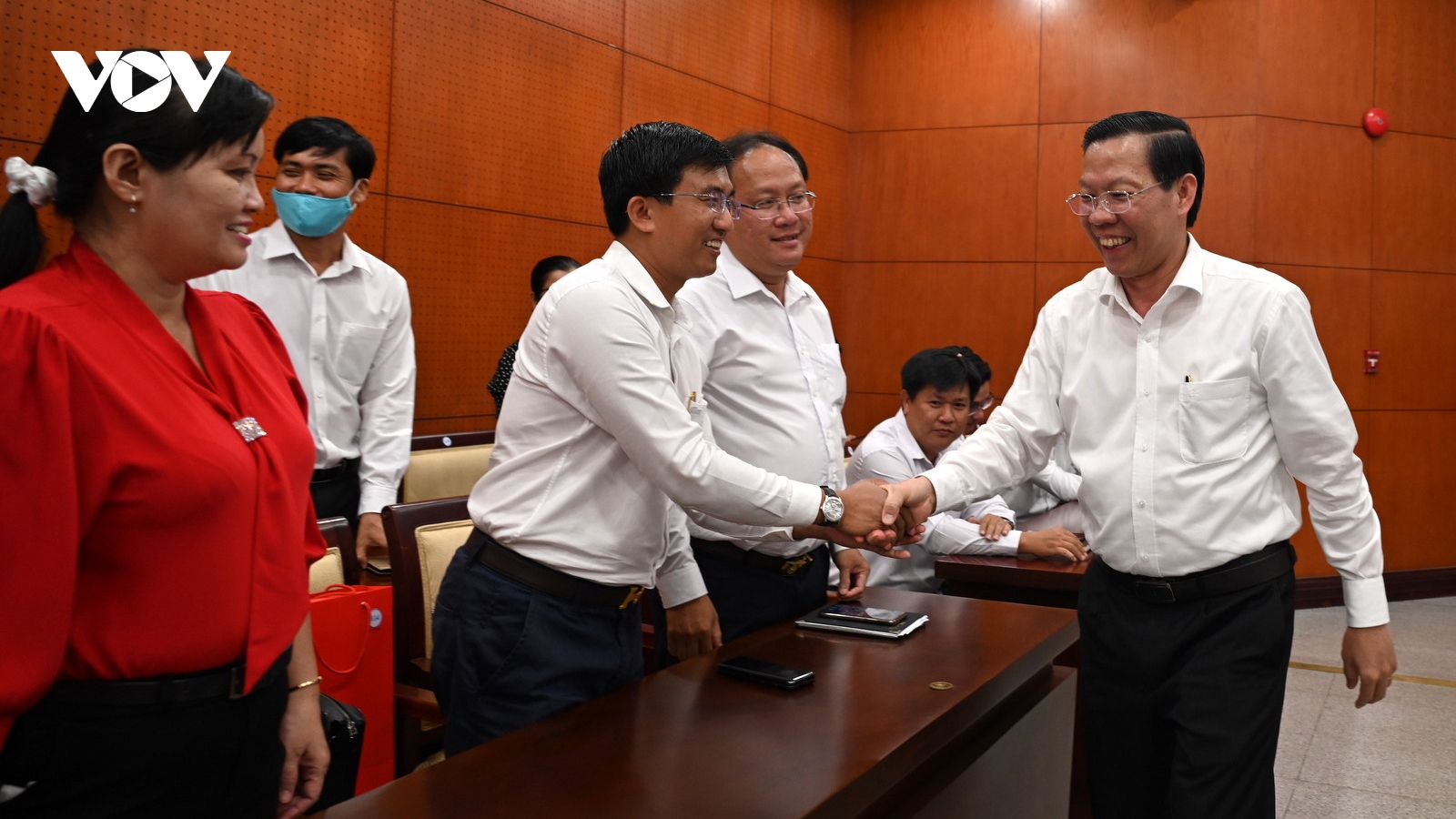 VOV.VN - Chiều nay (27/4), UBND TP.HCM tổ chức Hội nghị gặp gỡ giữa Chủ tịch UBND TP và Chủ tịch UBND các phường, xã, thị trấn năm 2023, với chủ đề: “Nâng cao hiệu quả thực thi công vụ, đẩy mạnh chuyển đổi số”. Tham dự Hội nghị có Ủy viên Bộ Chính trị, Bí thư Thành ủy TP.HCM Nguyễn Văn Nên.