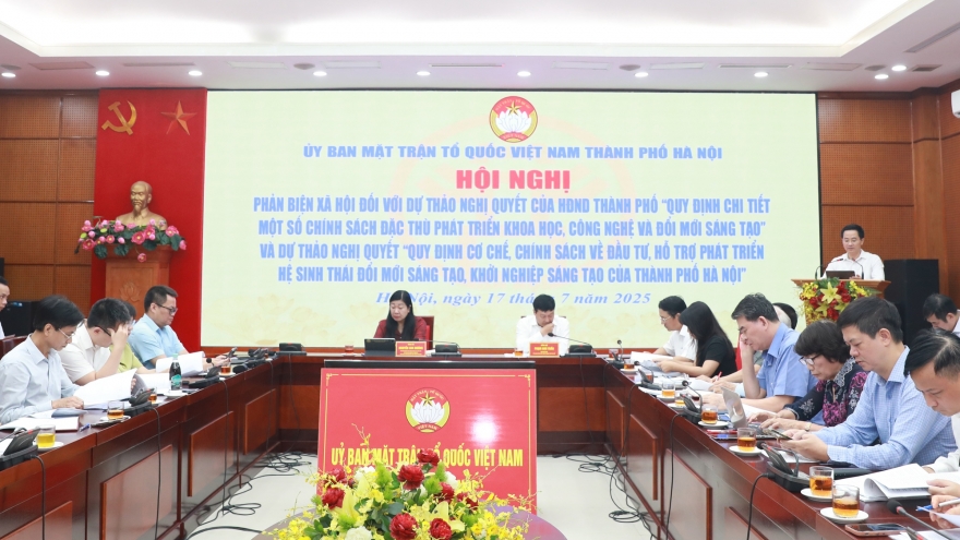 VOV.VN - Ngày 17/7, Ủy ban Mặt trận Tổ quốc Việt Nam Thành phố Hà Nội tổ chức Hội nghị phản biện xã hội đối với các dự thảo Nghị quyết của HĐND Thành phố phục vụ phát triển khoa học công nghệ gắn với Luật Thủ đô 2024. Chủ tịch Ủy ban MTTQ Việt Nam Thành phố Hà Nội Nguyễn Lan Hương chủ trì Hội nghị.