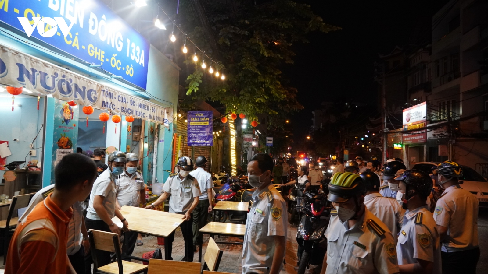 VOV.VN - Tối 9/3, Đội quản lý trật tự đô thị quận Phú Nhuận ra quân xử lý các quán nhậu, quán ăn uống ngang nhiên để bàn ghế, tủ đồ, bảng hiệu lấn chiếm vỉa hè, lòng đường trên địa bàn.