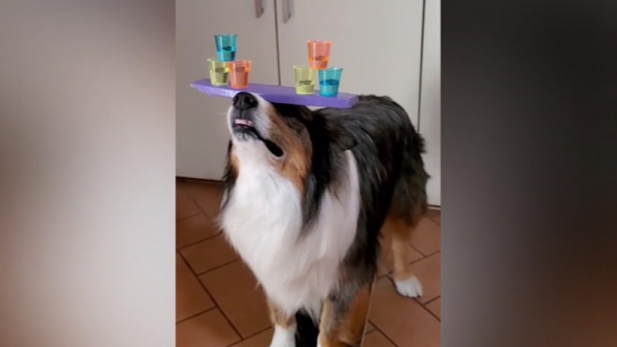 VOV.VN - Chú chó Rush đến từ Vasto, Italy khiến người xem vô cùng thán phục khi vừa cân bằng chiếc khay có 2 tháp nước trên đầu vừa di chuyển bằng ván trượt.