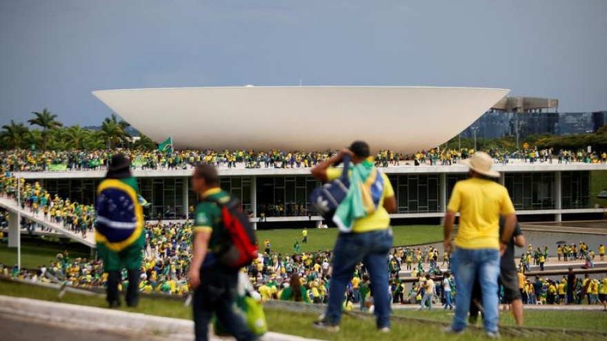 VOV.VN - Ngày 8/1, những người biểu tình quá khích đã tràn vào tòa nhà quốc hội Brazil, sau đó ồ ạt kéo vào bên trong và đập phá văn phòng của các nghị sĩ. Một số người biểu tình còn leo lên nóc tòa nhà quốc hội để giương cao biểu ngữ với lời kêu gọi quân đội "can thiệp”.