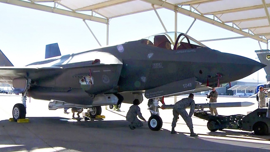 VOV.VN - Đoạn video ghi lại cảnh phi công và nhân viên mặt đất thuộc Phi đội số 12 của lực lượng thủy quân lục chiến Mỹ (MAG-12) tiến hành nạp vũ khí cho chiến đấu cơ F-35B Lightning II tại căn cứ không quân Hoàng gia Australia ở Tindal, Australia tháng 8/2022.
