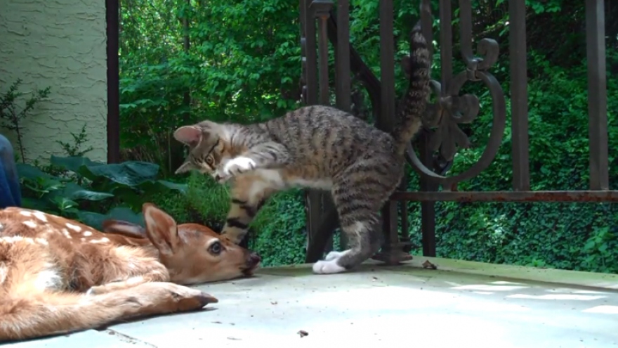 VOV.VN - Chú mèo Miro dường như rất hưng phấn khi nhìn thấy chú nai nhỏ trước cửa và tìm đủ mọi cách làm quen với người bạn thích nằm "im như thóc" này.