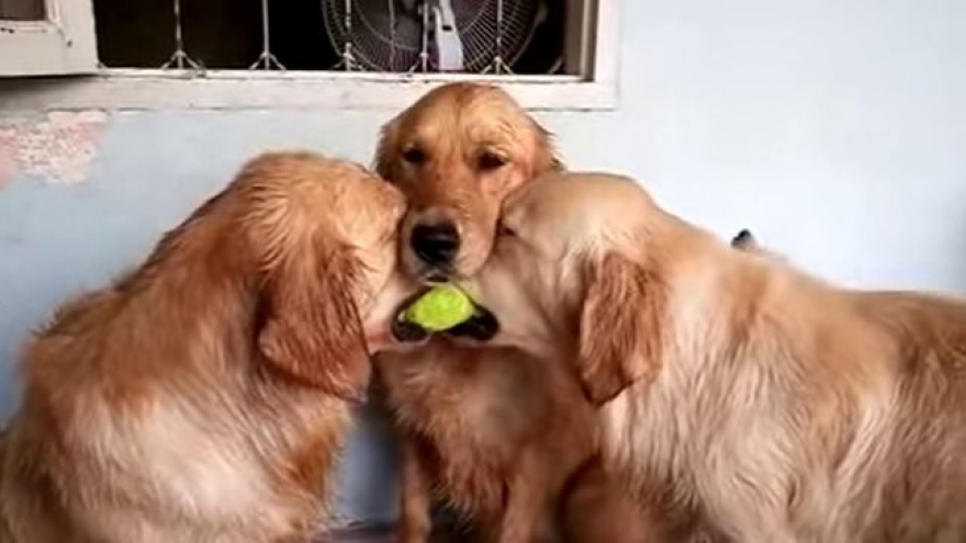 VOV.VN - Hai chú chó Golden Retriever quyết không chịu nhường nhau quả bóng tennis cho đến khi chú chó thứ 3 cùng tham gia vào cuộc chiến trong im lặng này.