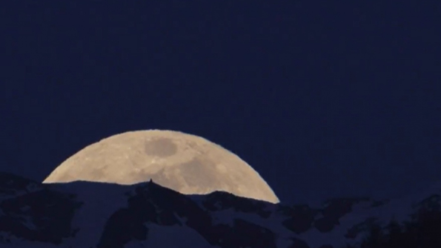 VOV.VN - Trăng hồng không phải Mặt trăng có màu hồng mà là nó sáng và lớn hơn bình thường. Trăng hồng nhô lên từ dãy Alps, Thụy Sĩ tạo nên cảnh tượng ngoạn mục.