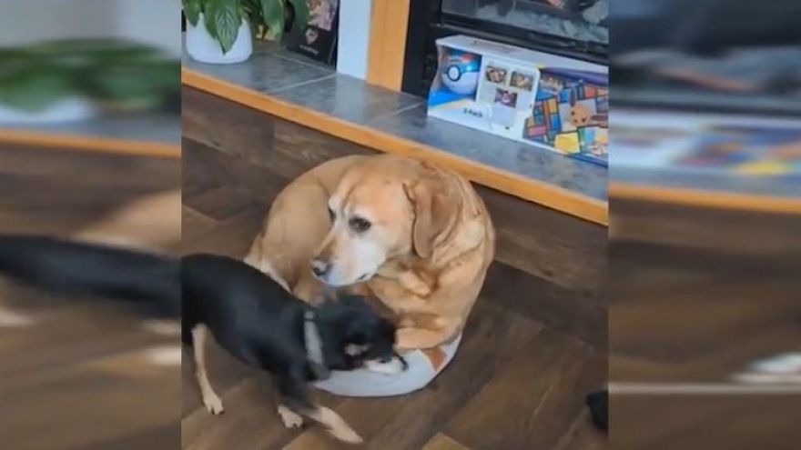 VOV.VN - Dưới đây là khoảnh khắc hài hước khi chú chó Labrador Retriever to lớn cố gắng nằm vào chiếc đệm nhỏ xíu mà không hề bận tâm đến chú chó con đang đi loanh quanh để đòi lại chỗ nằm.