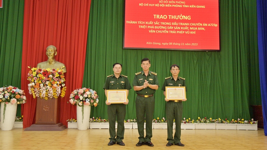 VOV.VN - 2 tập thể và 6 cá nhân ở Kiên Giang được Bộ trưởng Bộ Quốc phòng khen thưởng đột xuất vì đã có thành tích xuất sắc trong tham gia triệt phá đường dây sản xuất, mua bán, vận chuyển trái phép vũ khí.