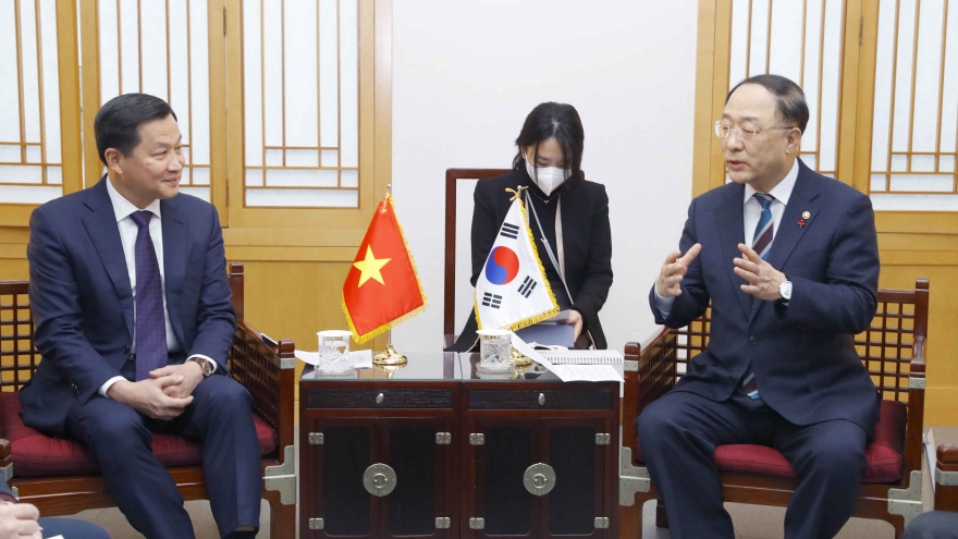 VOV.VN - Ngày 14/12, tại Seoul, Hàn Quốc, Phó Thủ tướng Chính phủ Lê Minh Khái đã hội đàm với Phó Thủ tướng kiêm Bộ trưởng Tài chính Hong Nam-ki trong khuôn khổ chuyến thăm chính thức Hàn Quốc của Chủ tịch Quốc hội Vương Đình Huệ từ ngày 12-15/12/2021.