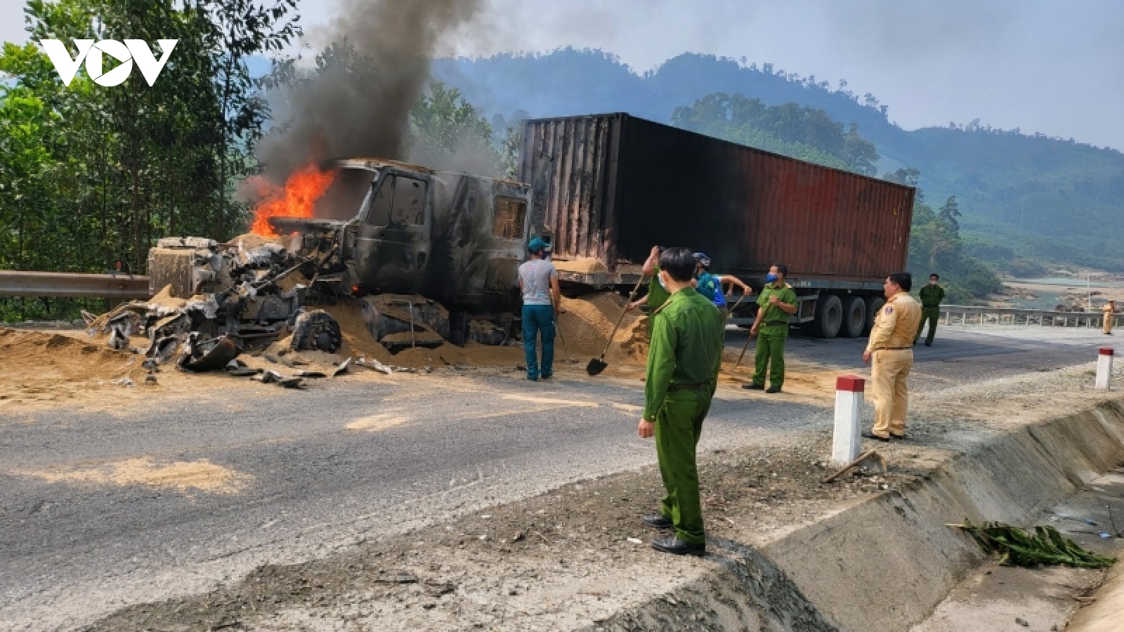 VOV.VN - Sáng 13/4, một xe container chở gỗ lưu thông trên đường Hồ Chí Minh, đoạn qua huyện Phước Sơn, tỉnh Quảng Nam bất ngờ bốc cháy, rất may tài xế đã kịp nhảy ra ngoài thoát thân.