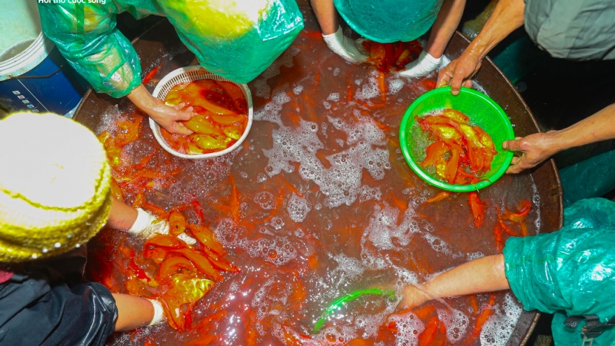 VOV.VN - Chỉ còn 2 ngày nữa là đến lễ cúng ông Công, ông Táo, những ngày này, tại chợ cá Yên Sở (Hà Nội) cảnh mua bán cá chép đỏ diễn ra tấp nập suốt đêm.