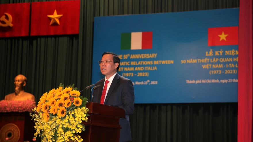 VOV.VN - Sáng nay (23/3), tại Nhà hát TP, Ủy ban Nhân dân TP.HCM long trọng tổ chức lễ kỷ niệm 50 năm thiết lập quan hệ ngoại giao Việt Nam – Italy. Đến dự có ông Enrico Padula, Tổng Lãnh sự Cộng hòa Italy tại Thành phố và Phu nhân, cùng các Tổng Lãnh sự, thành viên Lãnh sự đoàn.