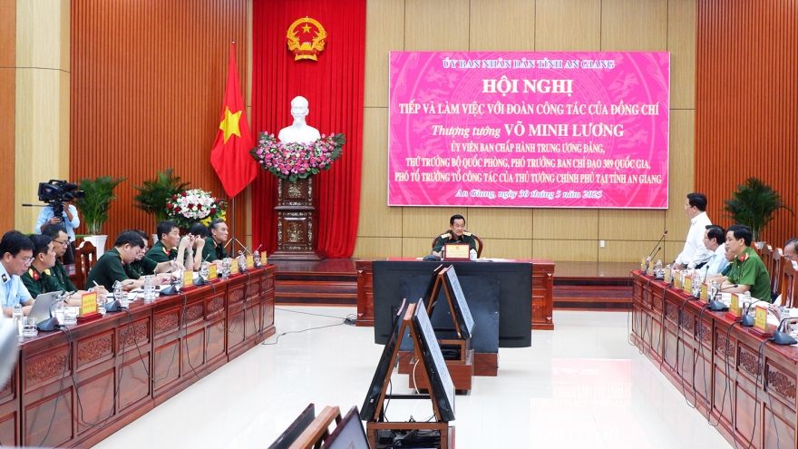 VOV.VN - Ngày 30/5, Thượng tướng Võ Minh Lương, Thứ trưởng Bộ Quốc phòng, Phó Trưởng Ban Chỉ đạo 389 quốc gia, dẫn đầu Đoàn công tác Chính phủ làm việc với tỉnh An Giang về công tác phòng, chống buôn lậu, gian lận thương mại và hàng giả.