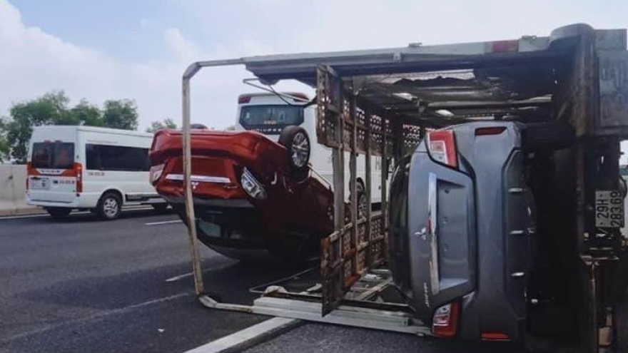 Xe chuyên dụng chở ô tô lật trên cao tốc sau va chạm với xe 7 chỗVOV.VN -Trên tuyến cao tốc Hà Nội-Hải Phòng, xe chuyên dụng chở ô tô đã va chạm với 1 chiếc xe 7 chỗ rồi lật ngang.