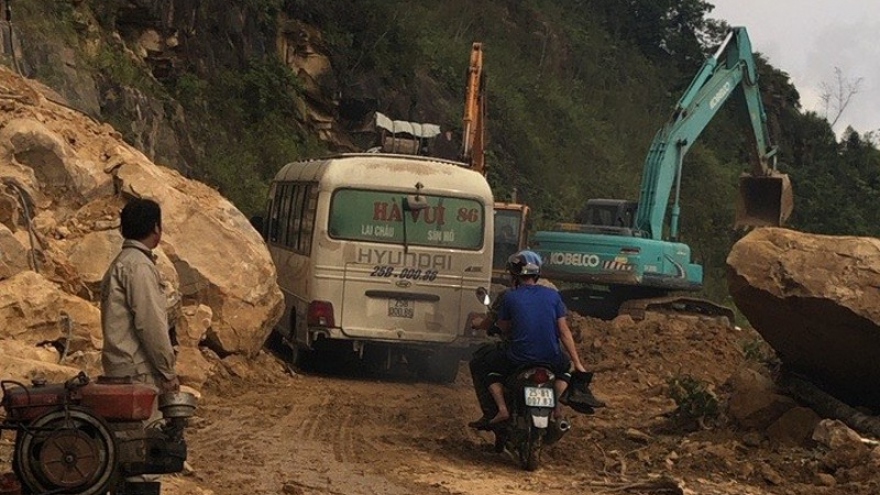 VOV.VN -Thời tiết trên địa bàn Lai Châu tiếp tục có mưa nhỏ, địa chất sườn núi tại điểm sạt yếu, đất đá vẫn tiếp tục rơi xuống gây khó khăn trong việc khắc phục