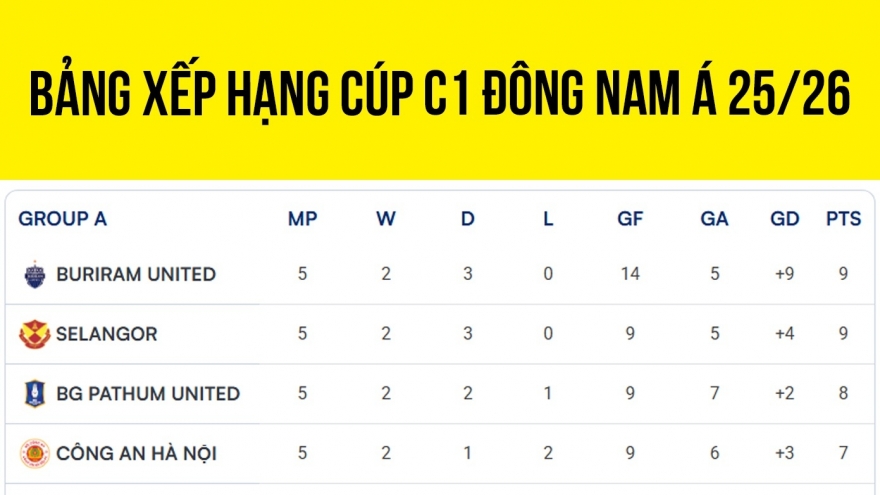 VOV.VN - Cập nhật bảng xếp hạng Cúp C1 Đông Nam Á 2025/2026 mới nhất sau lượt trận cuối bảng A: Buriram United (Thái Lan) và Selangor (Malaysia) chính thức giành vé vào vòng bán kết.