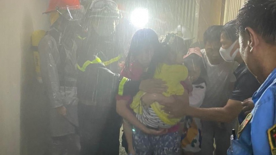 VOV.VN - Đội Cảnh sát PCCC&CNCH Công an quận Hà Đông đã xuất 2 chữa cháy, 1 xe chỉ huy, trung tâm 4 xuất 1 xe chữa cháy, 1 xe thang đến hiện trường, sử dụng họng nước vách tường tầng 10 để dập tắt đám cháy.