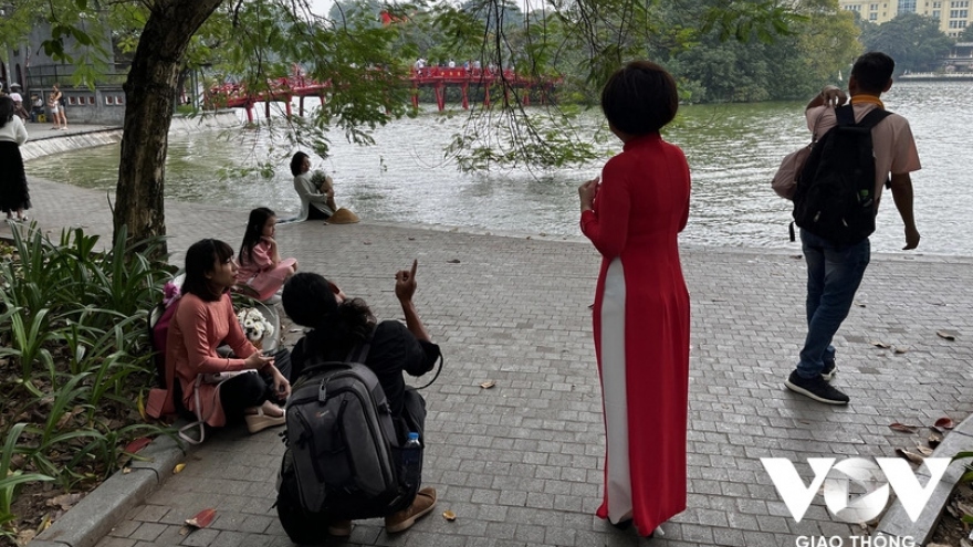 VOV.VN - Sáng sớm tinh mơ đi qua Hồ Gươm đã thấy các bà, các chị xúng xính áo dài, váy bồng tạo dáng chụp ảnh. Hà Nội mùa thu, nắng sớm mai vàng nhạt mỡ gà nhảy nhót trên những chiếc lá cây lộc vừng đã bắt đầu chuyển từ xanh sang vàng sậm, chớm đỏ… Hà Nội mùa này đẹp nhất trong năm!