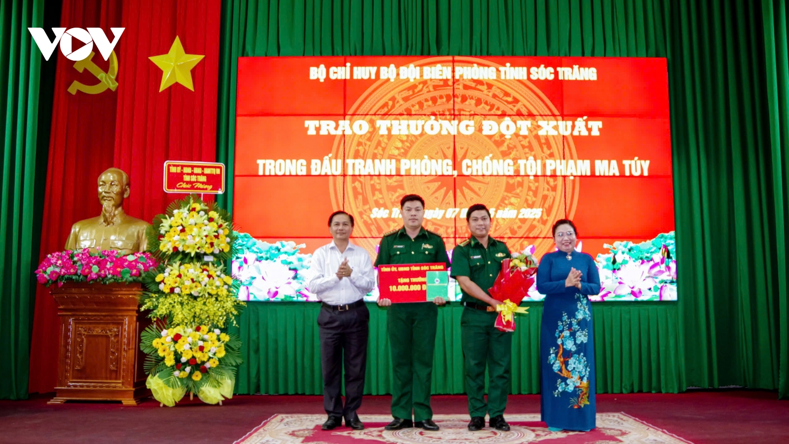 VOV.VN - Chiều 7/5, Bộ chỉ huy Bộ đội Biên phòng (BĐBP) tỉnh Sóc Trăng tổ chức trao thưởng đột xuất cho các tập thể, cá nhân có thành tích xuất sắc trong đấu tranh phòng, chống tội phạm ma túy.