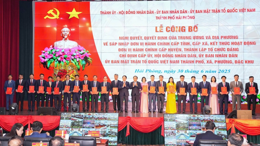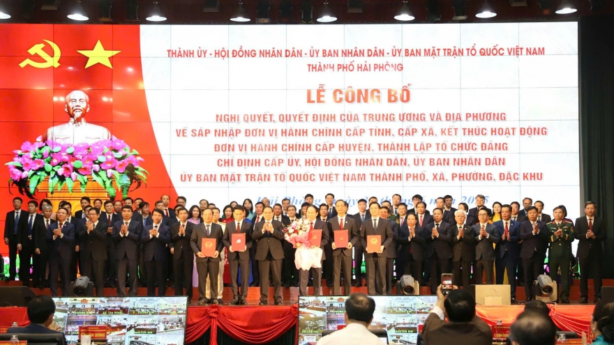 VOV.VN - Sáng nay (30/6), Thành ủy, HĐND, UBND, Ủy ban MTTQ Việt Nam TP Hải Phòng tổ chức Lễ công bố Nghị quyết của Trung ương và địa phương về sáp nhập đơn vị hành chính cấp tỉnh, cấp xã, kết thúc hoạt động đơn vị hành chính cấp huyện, thành lập tổ chức Đảng, chỉ định cấp uỷ, Hội đồng nhân dân, UBND, Uỷ ban Mặt trận Tổ quốc Việt Nam thành phố, xã, đặc khu.