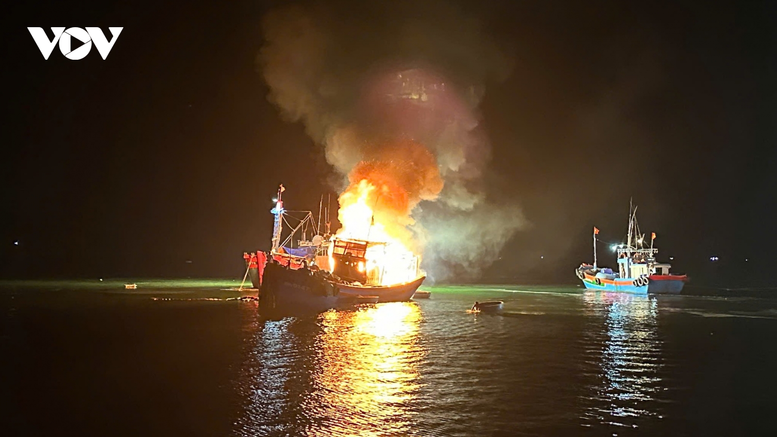 VOV.VN - Tại cửa Sa Kỳ, xã Tịnh Khê, tỉnh Quảng Ngãi, một tàu cá của ngư dân bất ngờ bốc cháy dữ dội khi đang neo đậu tránh bão số 5. Rất may, vụ việc không gây thương vong về người.